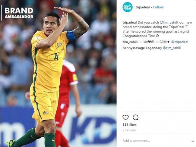 Организация заинтересовалась эпизодом, который произошел во время матча отборочного турнира к чемпионату мира-2018 между командами Австралии и Сирии (2:1). Кэхилл в дополнительное время забил победный мяч и отметил его, сложив руки в форме буквы "Т". Позднее в Instagram-аккаунте агентства появилась фотография этого момента с подписью: "Вы видели, как Тим Кэхил, наш новый бренд-амбассадор, показал нашу "Т" после того, как забил победный гол? Поздравляем, Тим!"