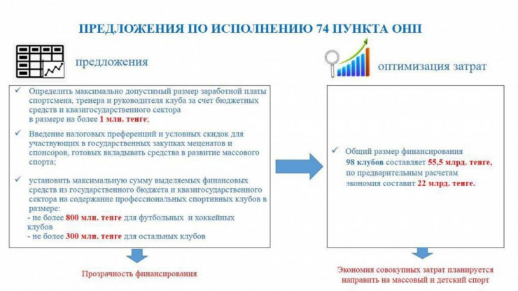 Как стало известно изданию от источника, близкого к ситуации, после распоряжения Президента Казахстана о сокращении финансирования профессионального спорта со стороны государственных и квазигосударственных компаний были разработаны методы сокращения бюджета. Финансирование от государства на один профессиональный клуб, как футбольный, так и хоккейный, составит 800 миллионов тенге.