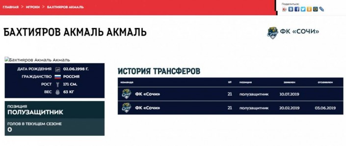 Профиль Бахтиярова на официальном сайте РПЛ появился 10 июля, а в графе "гражданство" у игрока указана Россия. За "Сочи" он выступает с января 2019 года и провел шесть матчей в Футбольной национальной лиге (ФНЛ), а его клуб стал серебряным призером и впервые в истории пробился в высший дивизион.