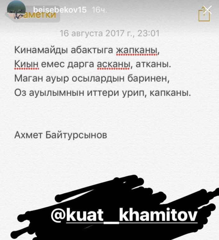 Ответил на критику Хамитова и защитник "Астаны" Абзал Бейсебеков. На своей странице в Instagram футболист опубликовал пост, в котором процитировал Ахмета Байтурсынова - казахского общественного и государственного деятеля, просветителя и литературоведа.
