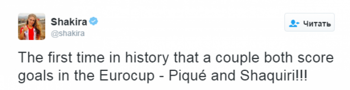 "Впервые в истории чемпионатов Европы оба представителя супружеской пары забивают гол - Пике и Шакири!", - написала она в Twitter.