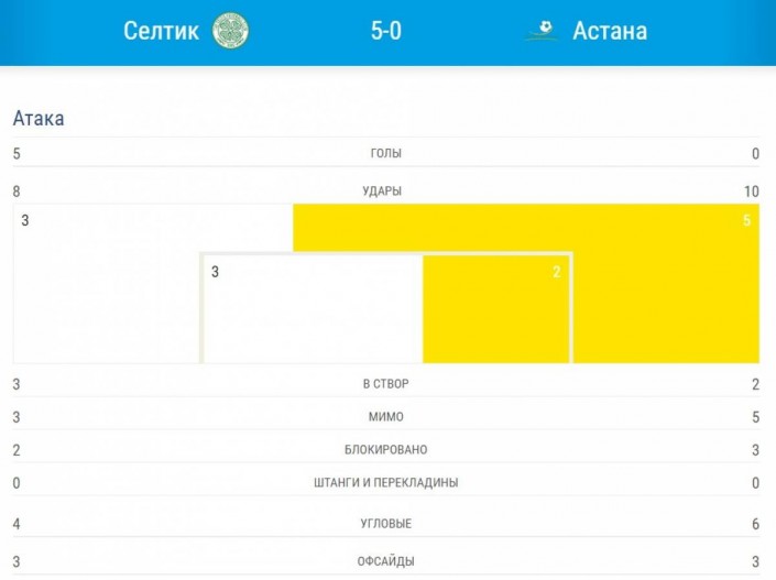 Между тем, в матче "Астана" - "Селтик" в 2017 году, судя по официальной статистике УЕФА, шотландцы нанесли восемь ударов. Из них всего три пришлись в створ ворот. Для сравнения "Астана" пробила десять раз и попала в створ пять раз. По владению мячом шотландский клуб превзошел оппонента - 63 процентов против 37.
