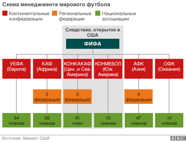 По данным следствия, футбольные чиновники, находясь в преступном сговоре, промышляли рэкетом и отмыванием денег на протяжении 20 лет. По информации западных СМИ, ссылающихся на заявление генпрокурора Швейцарии, минюст страны завел уголовное дело в связи с выбором стран-хозяек чемпионата мира по футболу в 2018 и 2022 годах.