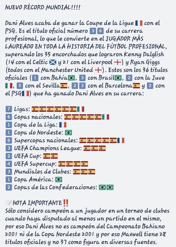 31 марта Алвес в составе парижской команды стал обладателем французского Кубка лиги. В финале турнира столичная команда разгромила "Монако" со счетом 4:1. Для Алвеса этот трофей стал 36-м в карьере, что сделало его самым титулованным игроком в истории. Он обошел британцев Кенни Далглиша и Райана Гиггза, которые побеждали в соревнованиях по 35 раз.