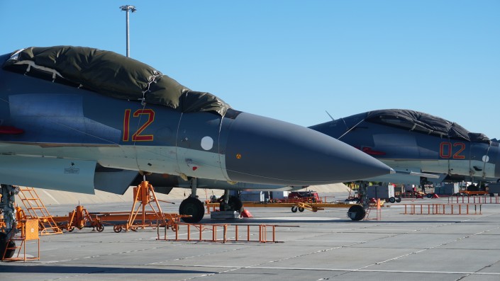 Во время учебно-тренировочных полетов пилоты набирают высоту до девяти тысяч метров. Су-30СМ поднимается на высоту 12 тысяч метров.