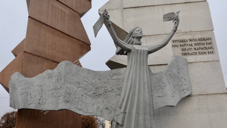 Сондай-ақ, композицияға қолымен ұшуға дайын тұрған әйелдің мүсіні енгізілген. Ол оң қолына татулыққа шақыру нышаны іспетті орамал ұстаған. Ал сол қолында бостандыққа талпынысты, ұшу белгісін білдіретін, қанатын жайған құсты ұстаған. Ескерткіштің үшінші бөлігі - оюлы панно.