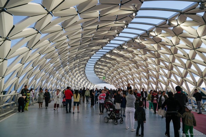 По словам создателей моста, если посмотреть на сооружение сверху, то его оболочка напоминает форму рыбы, символ Атырауской области. Также, конструкция состоит из 2 450 лепестков, которые не повторяются.