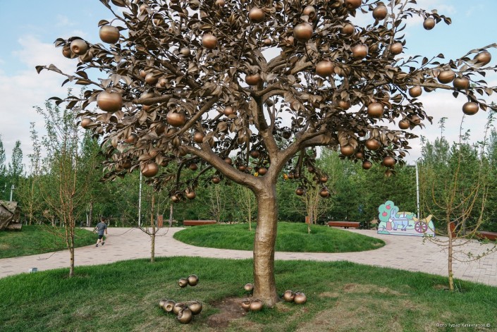 Здесь, с юга от центрального входа, в парк ведет главная аллея с фонтанами и площадью Апорта - символом Алматинской области, холмами, имитирующими горы, и беседками.