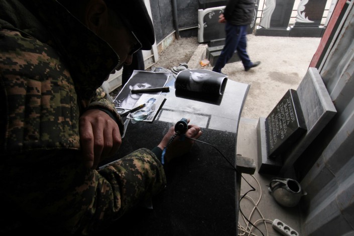 По улице разносится характерный шум. Это в многочисленных мастерских скульпторы наносят рисунок на гранит и мрамор.