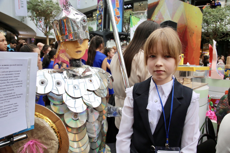 Так, ученица 6-го класса школы № 17 Анастасия Фролова представила своего экобатыра, сделанного из ТБО -  пластиковых бутылок, дисков, пакетов и так далее. "Из этого мусора мы сделали такого чудесного батыра. Я верю, что люди перестанут загрязнять наш мир", - заявила Анастасия.
