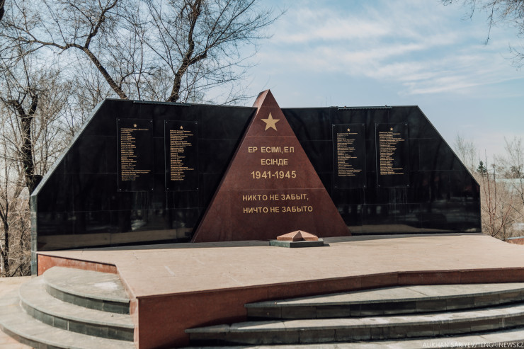 А в этом сквере стоит памятник воинам Великой Отечественной войны. Новый поставили недавно, раньше здесь стоял железный памятник. 78 местных уйгуров ушли тогда на фронт, вернулись 25, из них половина после войны умерли: ранения и так далее. В честь них и поставили монумент, здесь ее папа (показывает на супругу), и мой, и дядя, и дед.