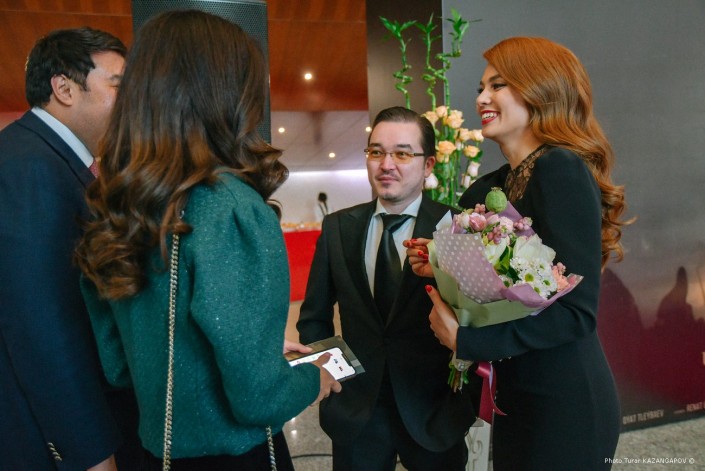 Публика тепло встретила главную героиню картины. Было много цветов и желающих сделать селфи с "царицей Томирис". Но большая часть зрителей снимали ее со стороны на камеры смартфонов. В их числе мы заметили мажилисмена Владислава Косарева, который тоже пришел на премьеру.