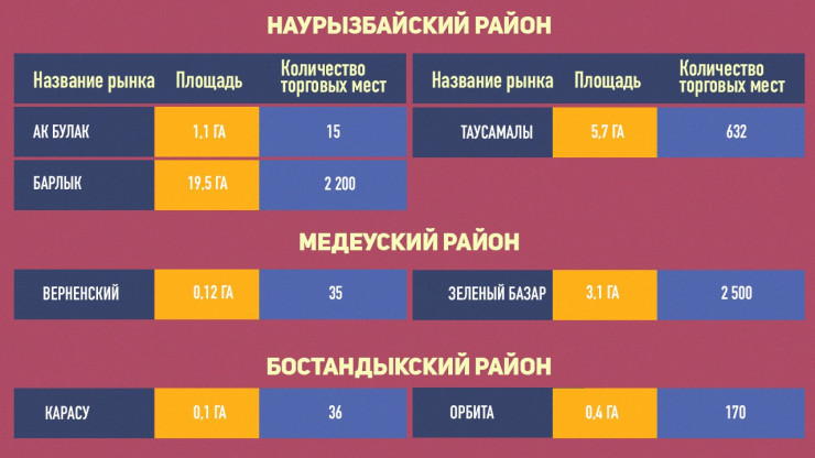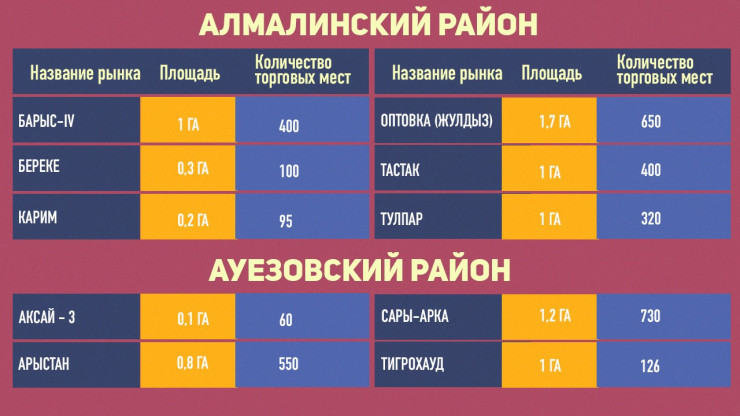 В Турксибском районе расположено 8 рынков, в Алмалинском - 6, Ауэзовском - 4, Наурызбайском - 3, Бостандыкском и Медеуском районах- по 2 рынка.