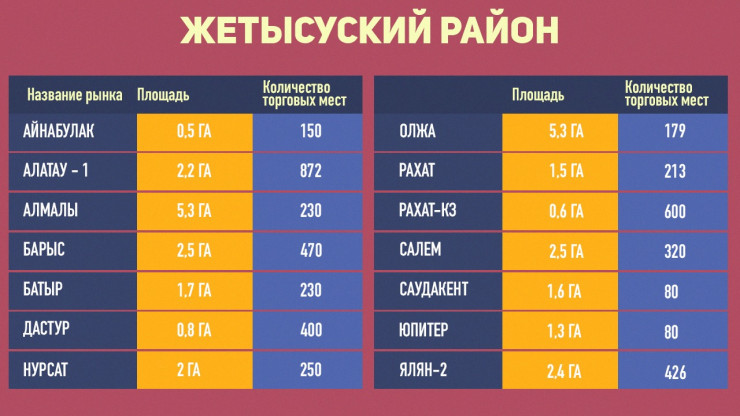 Наибольшее количество рынков расположено в Жетысуском районе - 14 и в Алатауском - 12.