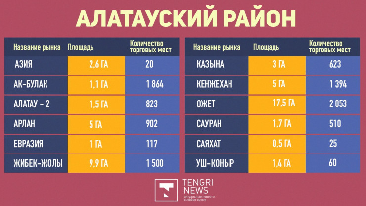 Общая площадь 51 рынка составляет 136,22 гектара. С учетом того, что территория Алматы - 68 тысяч гектаров, базары занимают 0,2 процента площади города.
