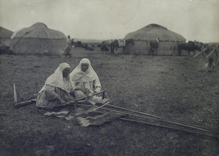 Ткачихи. Женщины ткут на узконавойном станке безворсовый ковер - алаша, его еще называют такыр килем. Такие ковры использовались повсеместно. Ворсовые ковры были в основном только на юге Казахстана.
