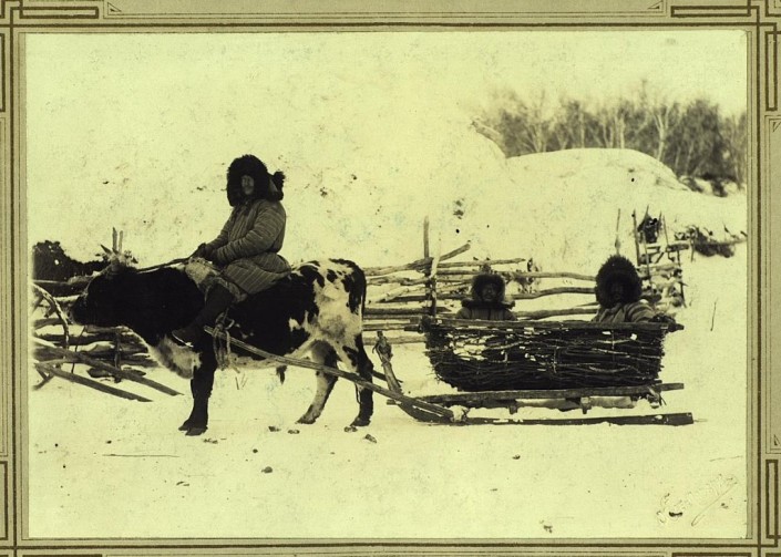 Казахи-ездоки на быке, запряженном в сани.  Когда говорят о казахах, то многие сразу же представляют человека на коне, поэтому такие фотографии могут некоторых озадачить. Однако лошади были не у всех. Лошадь считалась признаком зажиточности, поэтому многие передвигались на быках и коровах. Даже в работах Шокана Валиханова есть об этом упоминания.