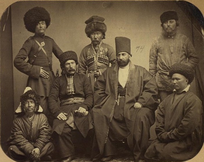 Портрет жителей Астраханской губернии: армянин, калмык, персиянин, русский ловец, киргиз, татарин. В Астраханской губернии проживали люди различных национальностей. Казахи жили и до сих пор живут на юге этого региона, в основном это представители младшего жуза.  Персианин на фото, скорее всего, купец из Ирана.