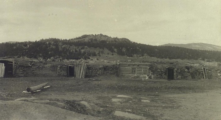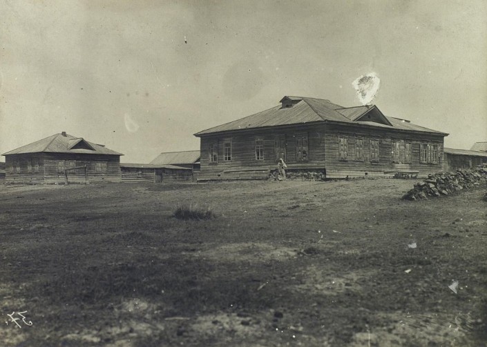 Казахская зимовка в сосновом лесу. Казахи в основном зимовали на юге. Это фото указывает, что они уже начали оседать и построили зимовку в северном регионе. Дома из сруба казахи начали строить по типу русских жилищ.