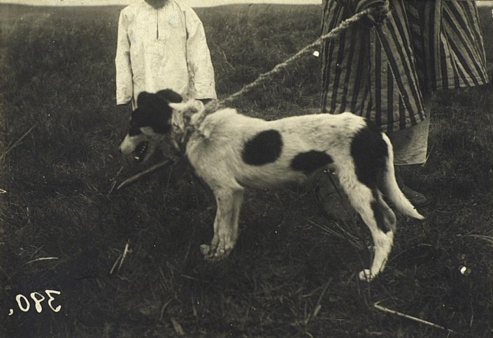 Собака. К шее собаки привязана палка, чтобы она не могла пролезть в юрту.