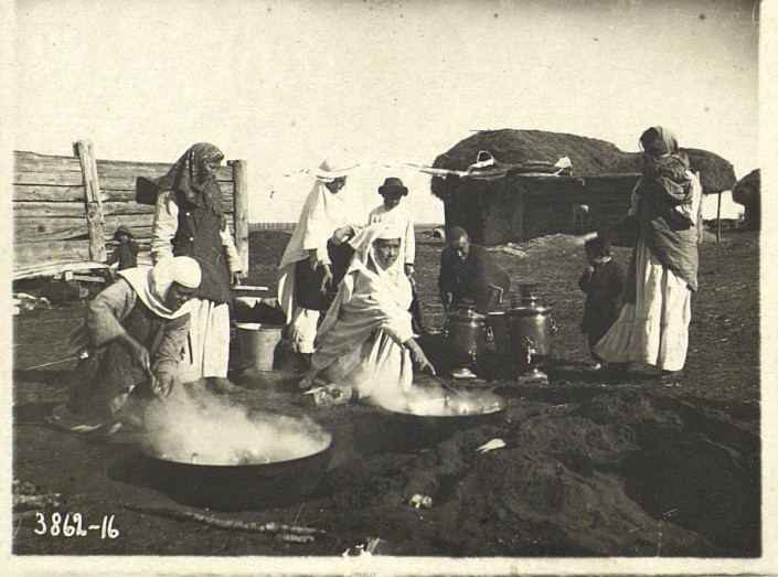 Приготовление пищи. Варят мясо в двух казанах, поставили два самовара, значит, готовятся угощать гостей.