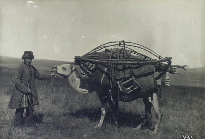 Верблюд, нагруженный домашним скарбом. Верблюдов было очень удобно использовать при кочевке. Такое средство передвижения могли себе позволить только самые богатые.