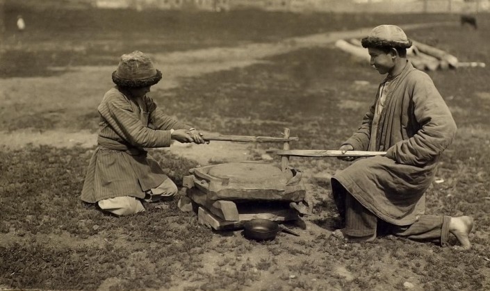 Молодые люди у жернова. Два подростка делают муку с помощью приспособления, которое казахи называли кол диырмен.
