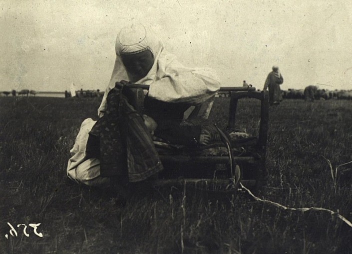 Женщина у колыбели. Бесик - неотъемлемая часть кочевого народа. Он был удобен тем, что в нем можно было легко перевозить ребенка. Малыш был привязан, и не нужно было бояться, что он упадет.