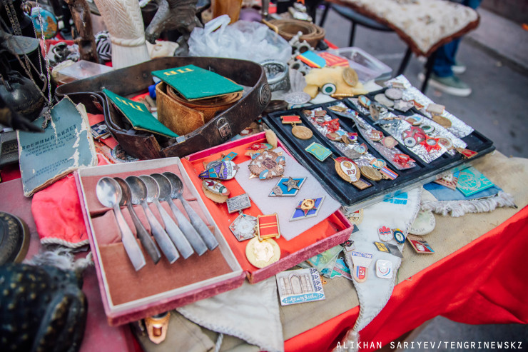 "Я здесь торгую уже третий год, — рассказывает Жанболат Байгалиев, мы тут вместе с напарником Аспандияром работаем. В основном приходят те, кому за 40-50, говорят, могут что-то купить ради воспоминаний об отце или деде. Людям интересна продукция из фарфора, бронзы, винтажные вещи. А сам я по профессии юрист, но семь лет назад мне попался на глаза советский значок, и я заинтересовался. Теперь вы сами видите, до каких масштабов все разрослось.