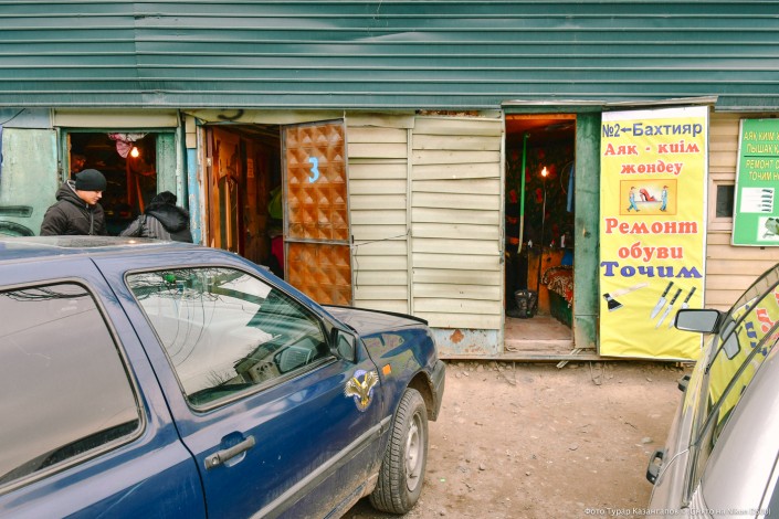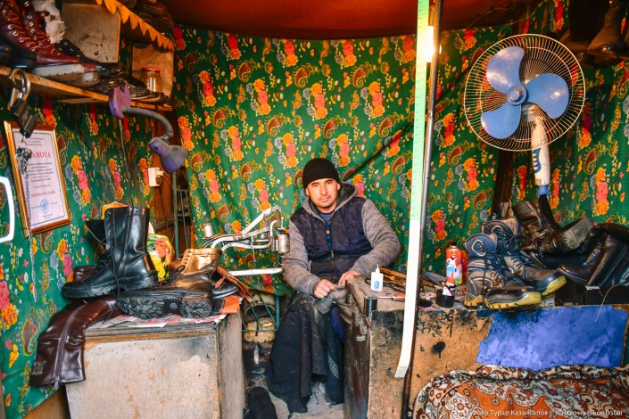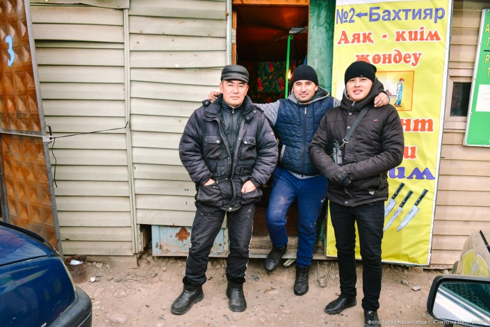 "Все так думают. Но большинство людей здесь китайское не берут же. Если покупают, то обычно бизнесмены оптом и на продажу, дальше отправляют. А местные в большинстве своем предпочитают носить обувь ручной работы, заказывают ее в Алматы", - говорит Бахтияр. "Мы здесь все родственники, Садыковы и Шариповы", - говорит еще один сапожник.