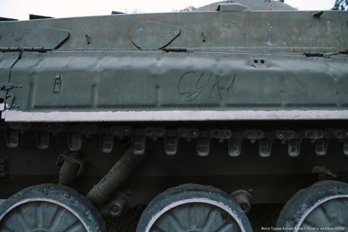 Рядом с памятниками героям в парке можно увидеть БМП.