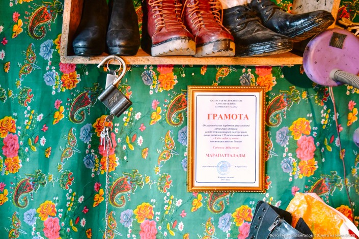 На стене можно увидеть грамоту, она вручена отцу Бахтияра на 135-летие Жаркента.