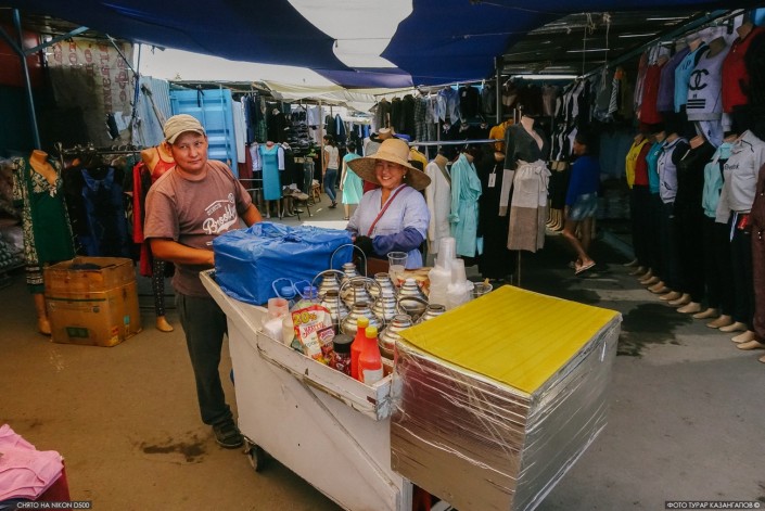Проходя между торговых рядов, мы с фотографом то и дело замечаем продавцов с пластмассовыми стаканами, полными чая с молоком. Горячие напитки и бутерброды продает здесь семейная пара из Кыргызстана.