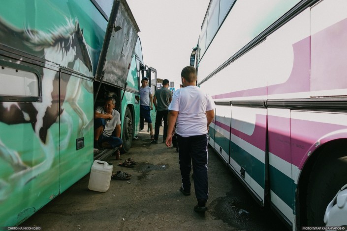 Из беседы с продавцами рынка мы поняли, что большинство из них приехали работать в Астану из Южно-Казахстанской области. Возможно, поэтому большая часть автобусов здесь с госномерами 13-го региона.