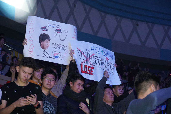 Трибуны Дворца единоборств Jekpe Jek были заполнены молодыми людьми. Это фанаты команды Syman Gaming пришли поддержать своего любимого игрока Рамазана Ramz1k Башизова.