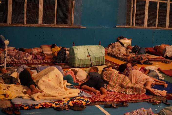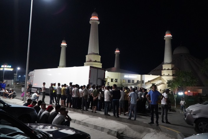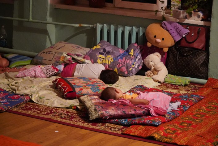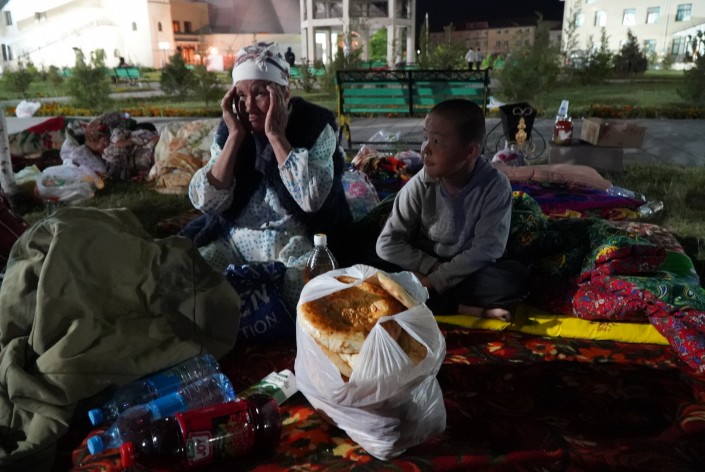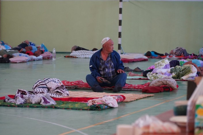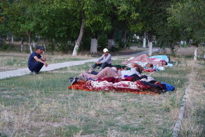 К утру в организованных для эвакуированных местах людей стало меньше. Некоторые, как эти люди на фото, решили спать прямо на улице из-за духоты в переполненных помещениях. Многие разъехались к родственникам, какая-то часть поехала обратно в Арысь в попытке прорваться через блокпост и забрать свои вещи.