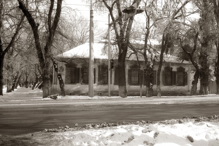 Дом садовода Бреусова. Улица Октябрьская (ныне Айтеке би), угол улицы Емелева (братьев Абдуллиных). В годы гражданской войны здесь размещался политотдел 3-й Туркестанской дивизии. В доме жил и работал писатель Д.А. Фурманов. Фото сделано в 1970-х годах.