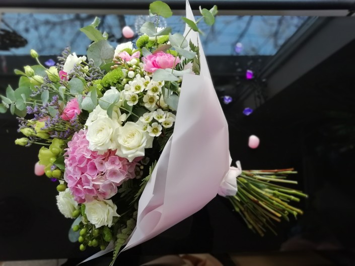 Например, в этом букете нежные розовые гортензии отлично сочетаются с белыми розами спрей и ваксом, который дарит букету тонкий аромат. Весенние краски и обилие оттенков зеленого создают неповторимое ощущение весны – это заслуга гиперикума, хризантем сантини, лизиантуса и гвоздики.