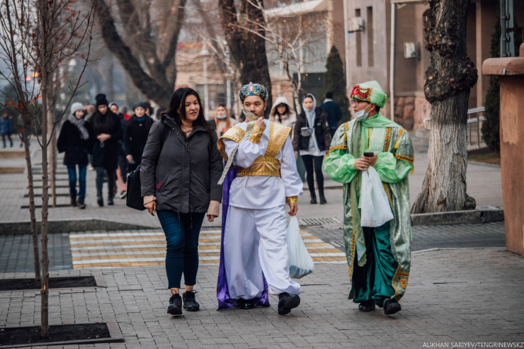 В этот момент где-то рядом слышим: "Не желаете фото на память?" Девушку в костюме ангела зовут Аружан, говорит, что сегодня они с другом решили прогуляться, а заодно пофотографировать людей. Несмотря на то, что пока они студенты, у них уже есть своя фотостудия и большое желание работать. А за работу берут от 500 до 800 тенге.