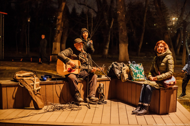 После восьми вечера Панфилова и Арбат постепенно стихают. "Это удивительно, февраль - и такая погода теплая", - шепчет кто-то из прохожих (мы снимали репортаж в тот день, когда холода начали отступать). И только где-то вдалеке мы слышим исполнителя, который поет беспрерывно, да, в это трудно поверить, но пауз он не делает вообще. И любой желающий может к нему присоединиться, для этого музыкант кладет рядом с собой различные инструменты. "Иногда здесь собираются барабаны, флейты, знаете, как все это звучит", - говорит нам алматинка, которая каждый день приходит сюда. Чтобы не сломать ту магию, которую создает автор, мы стараемся не задавать вопросов, а зачем, здесь и без слов все понятно, поэтому мы просто слушаем.
