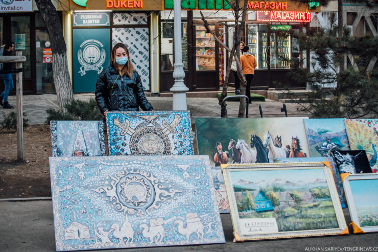К нашему разговору подключается соседка Арии, говорит, что продает картины уже 20 лет, стоит здесь и зимой, и летом. "Обидно, что большинство сейчас покупают больше мазню, чем живопись, - сетует женщина. - Это потому, что люди не разбираются, им нужна картина, чтобы "заклеить обои". Но есть и люди со вкусом, они берут работы казахстанского художника Смурыгина, его темы гор и городских пейзажей в тренде, вообще, я заметила, что у казахстанцев появился интерес к импрессионизму.