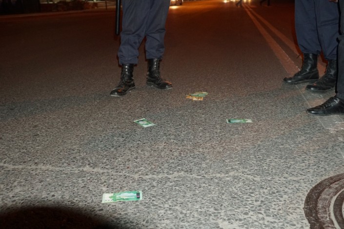 Купюры на дороге сразу же привлекли очевидцев: люди бросились собирать деньги, однако постовые не дали им этого сделать, выставив вокруг оцепление.