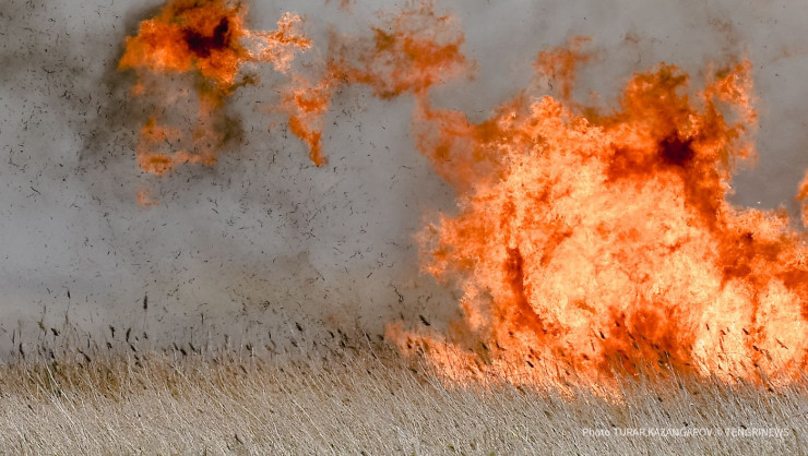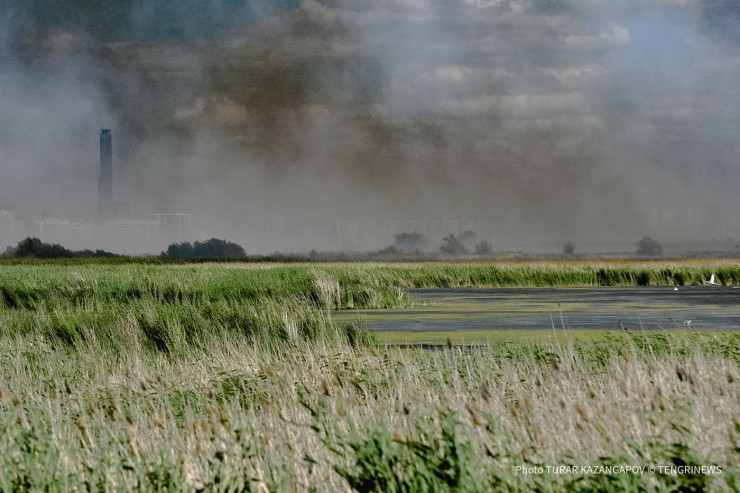 На окраине Нур-Султана в болотистой местности из-за продолжительной жары загорелся сухой камыш. Вторые сутки пожарные борются с огнем, используя воду, песок и вертолет. Фотокорреспондент Tengrinews.kz снял степной огонь и задымленный Нур-Султан.