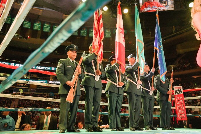 Перед главным боем звучат гимны стран боксеров-участников - Казахстана, Канады и США на правах страны, проводящей вечер бокса.