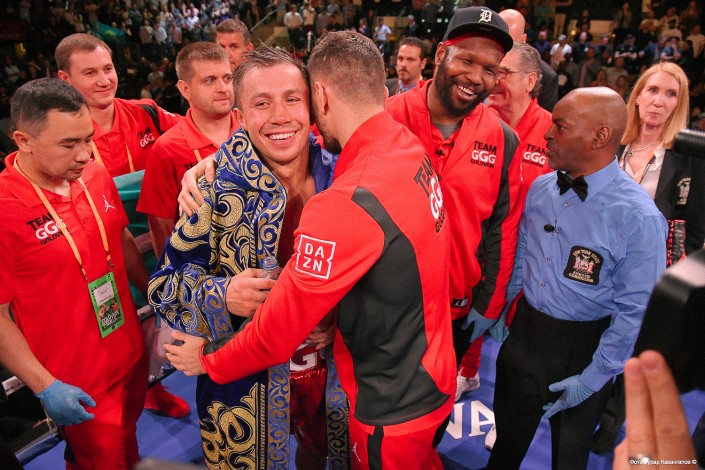 Геннадий доволен исходом боя. Рад победе казахстанца и его промоутер Том Леффлер.