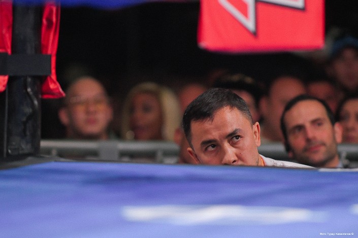 Казахстанец с самого начала поединка действует первым номером, заняв центр ринга.