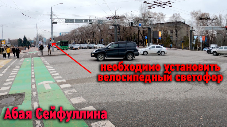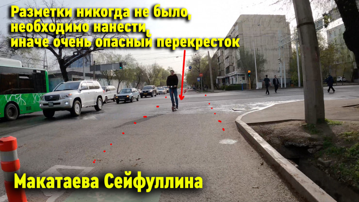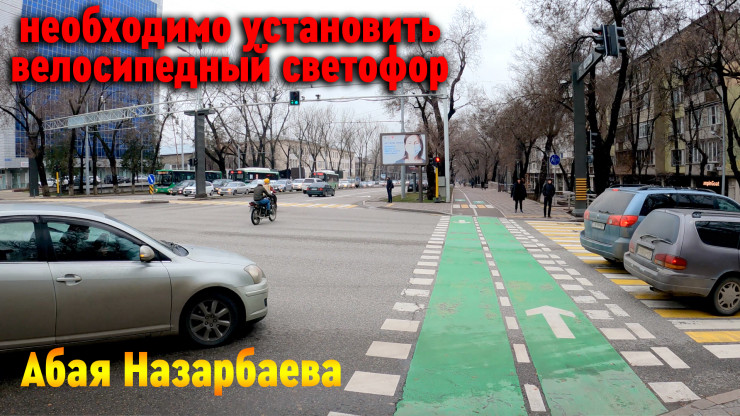 "Перед Манаса нужно убрать крайнюю правую полосу, которая появляется за 30 метров до перекрестка. До перекрестка три полосы прямо. После перекрестка - две полосы прямо. Из-за этой третьей полосы автомобили выезжают прямиком на велополосу и едут по ней, образуя пробку на перекрестке.