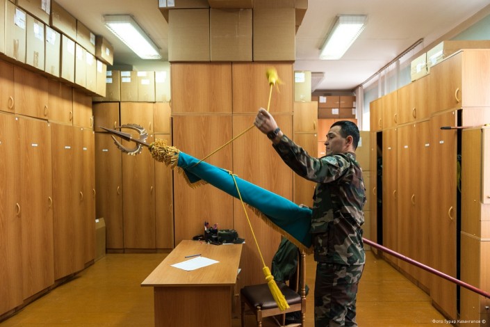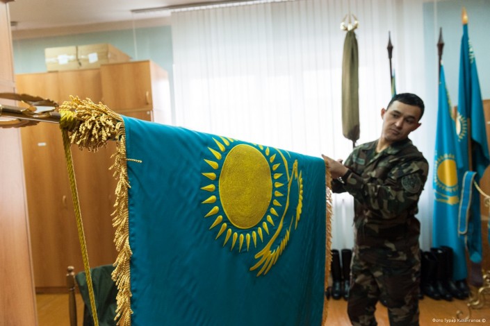 "Моя задача - хранить Государственный флаг. Полотно двухслойное, весит около семи килограммов. Если солдат на мероприятии, то он держит этот флаг около часа, а то и больше. Знаменосцев тренируют ежедневно. Они на плацу занимаются с рабочим флагом, выходят, шагают, стоят не шевелясь. Есть еще так называемый "стакан". В него солдат должен с точностью установить флаг, поставив его в этот "стакан", - делится некоторыми секретами знаменосцев начальник склада церемониального батальона Арман Мейрамов.