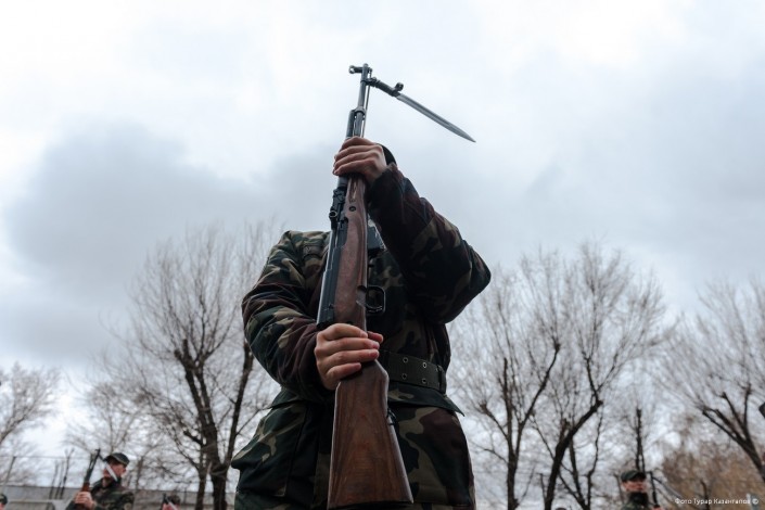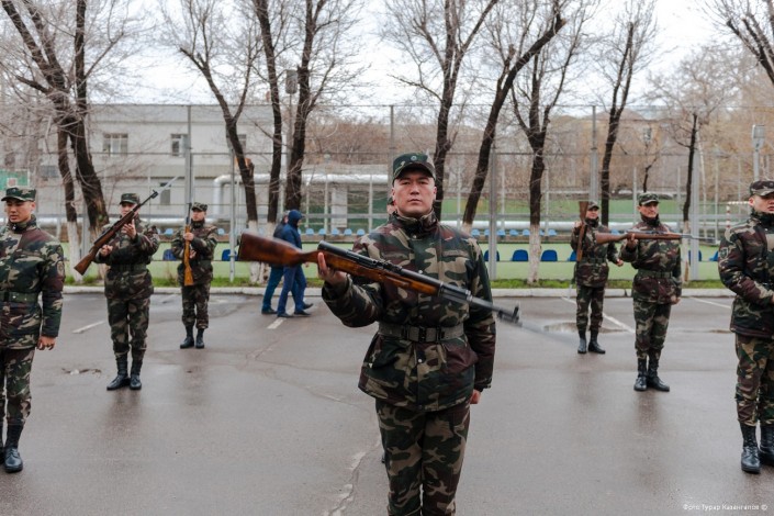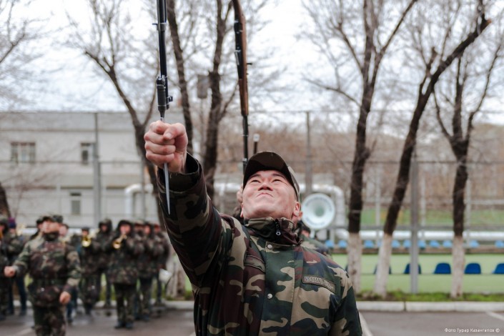 "Во время тренировок, подготовки с оружием или без в начале бывают ошибки. Бывает, что неправильно оружие ставят, держат. Во время подготовки мы прибегаем к учебникам, книгам по военной тематике. А вот по части проведения самого мероприятия, оформления у нас литературы нет. Поэтому мы сами уже, основываясь на опыте, проводим мероприятия и выполняем все без ошибок", - рассказывает Кайрат Молдабаев.