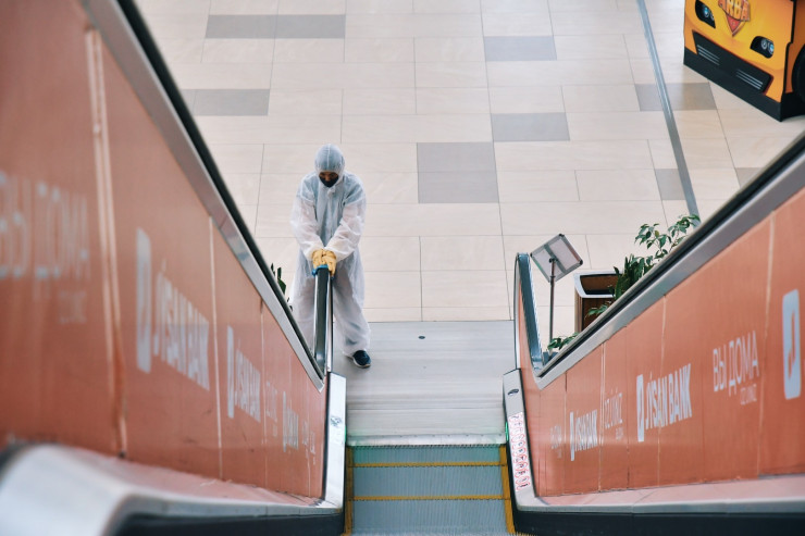 В ТРЦ можно встретить людей в защитных костюмах. Они проводят дезинфекцию поверхностей.